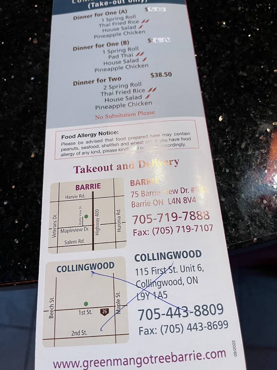 Welcome to Green Mango Tree, a delightful Thai restaurant located at 75 Barrie View Dr, Barrie, ON. This gem has garnered rave reviews for its welcoming atmosphere and exceptional flavors. Customers consistently praise the Pad Thai for its perfect spice balance and the freshness of its ingredients.